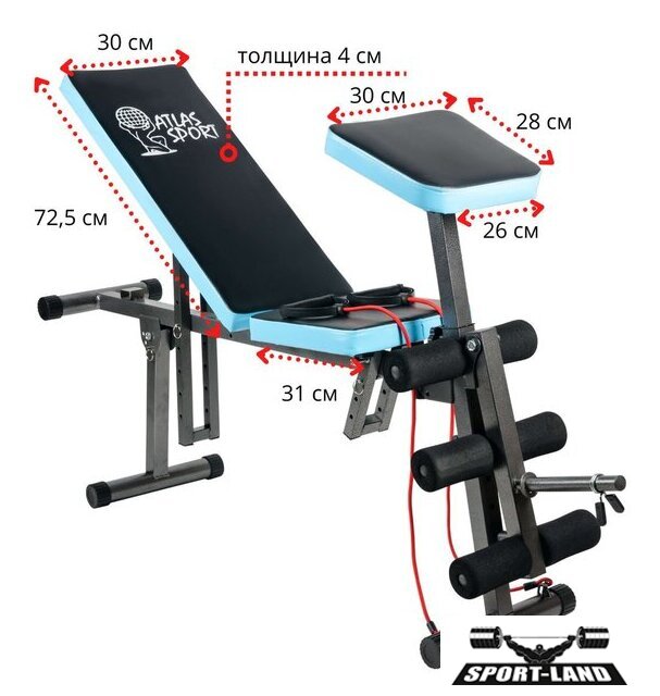 | Конструкция | универсальная скамья, скамья для жима штанги, парта Скотта, скамья для пресса, блок для ног, эспандеры |