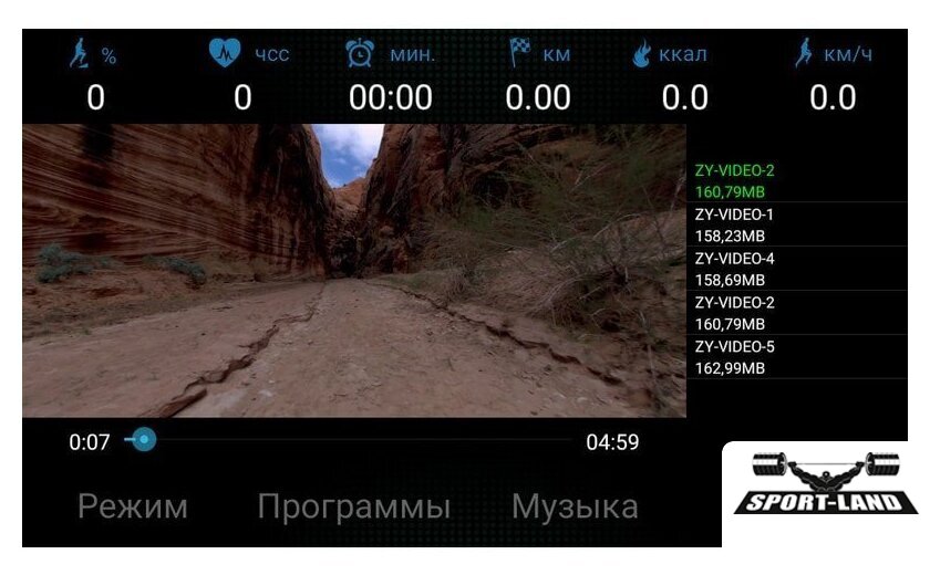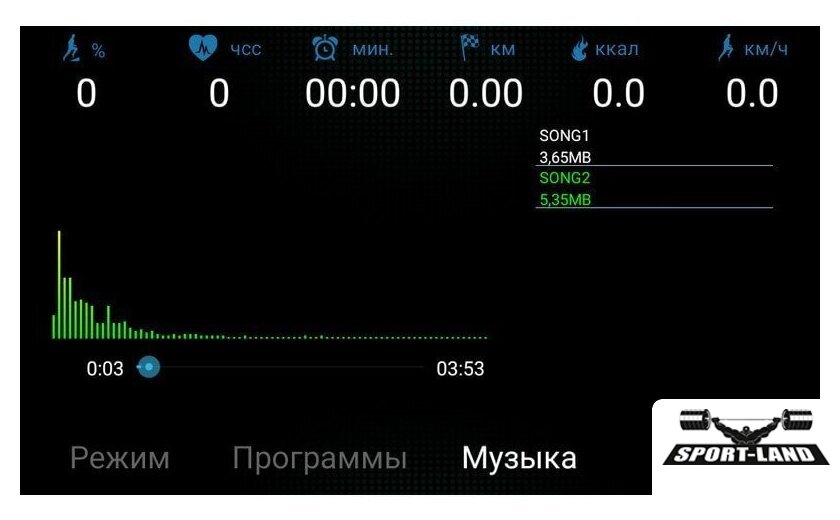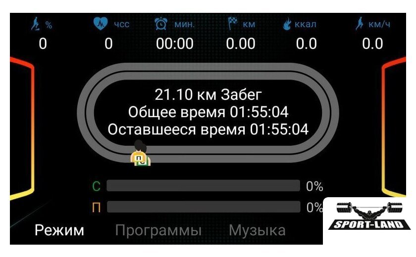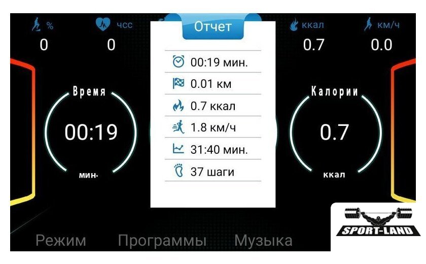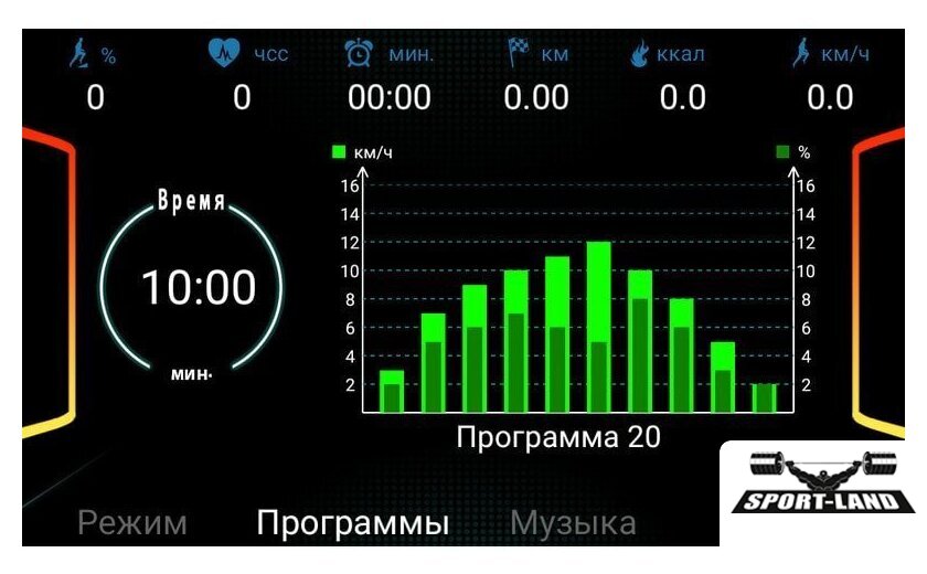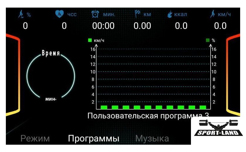 | Все программы | Время Скорость Дистанция Пульс Калории Угол наклона |