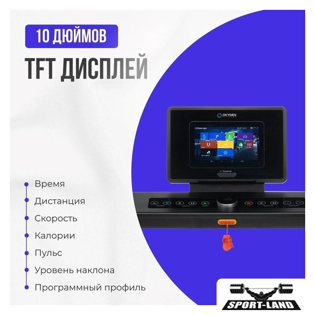 | Показания на дисплее | время, скорость, дистанция, уровень наклона, калории, пульс, профиль программы |