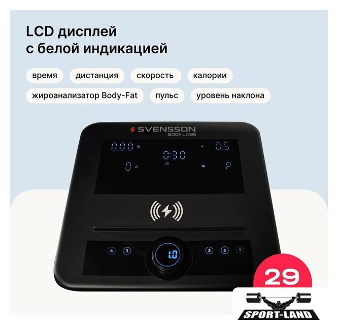 Показания на дисплее | скорость, калории, время, дистанция, пульс, уровень наклона, жироанализатор, бег |