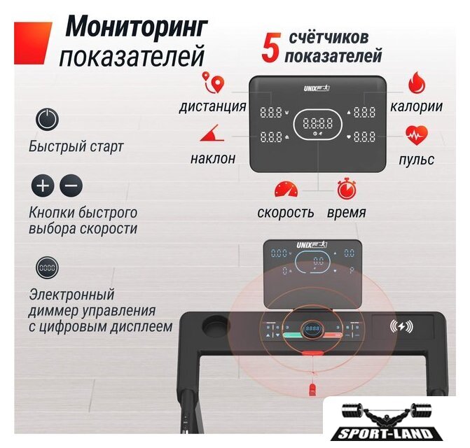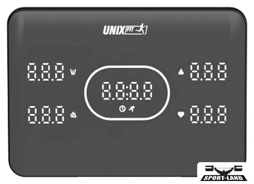 | Отображаемая информация | время тренировки, пройденная дистанция, текущая скорость, расход калорий, пульс, угол наклона |